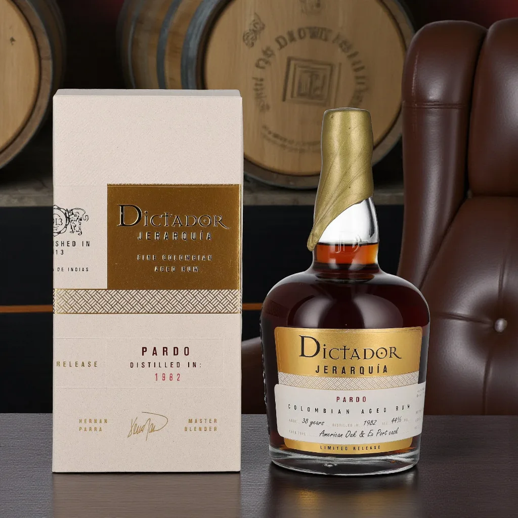 Au nez, couches de vanille, de caramel brun et de café torréfié se mêlent à des touches de fruits secs (noix, dattes), d’écorces d’orange confites et de bois poli; le tabac blond et une pointe de mélasse apportent profondeur et chaleur, comme le déploie naturellement le Dictador Jerarquía Pardo 1982 – 38 ans.