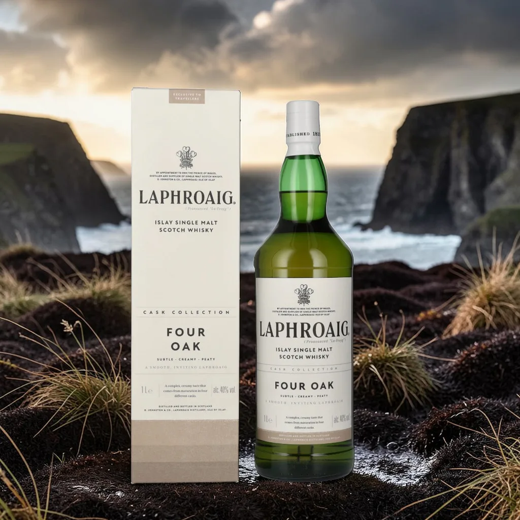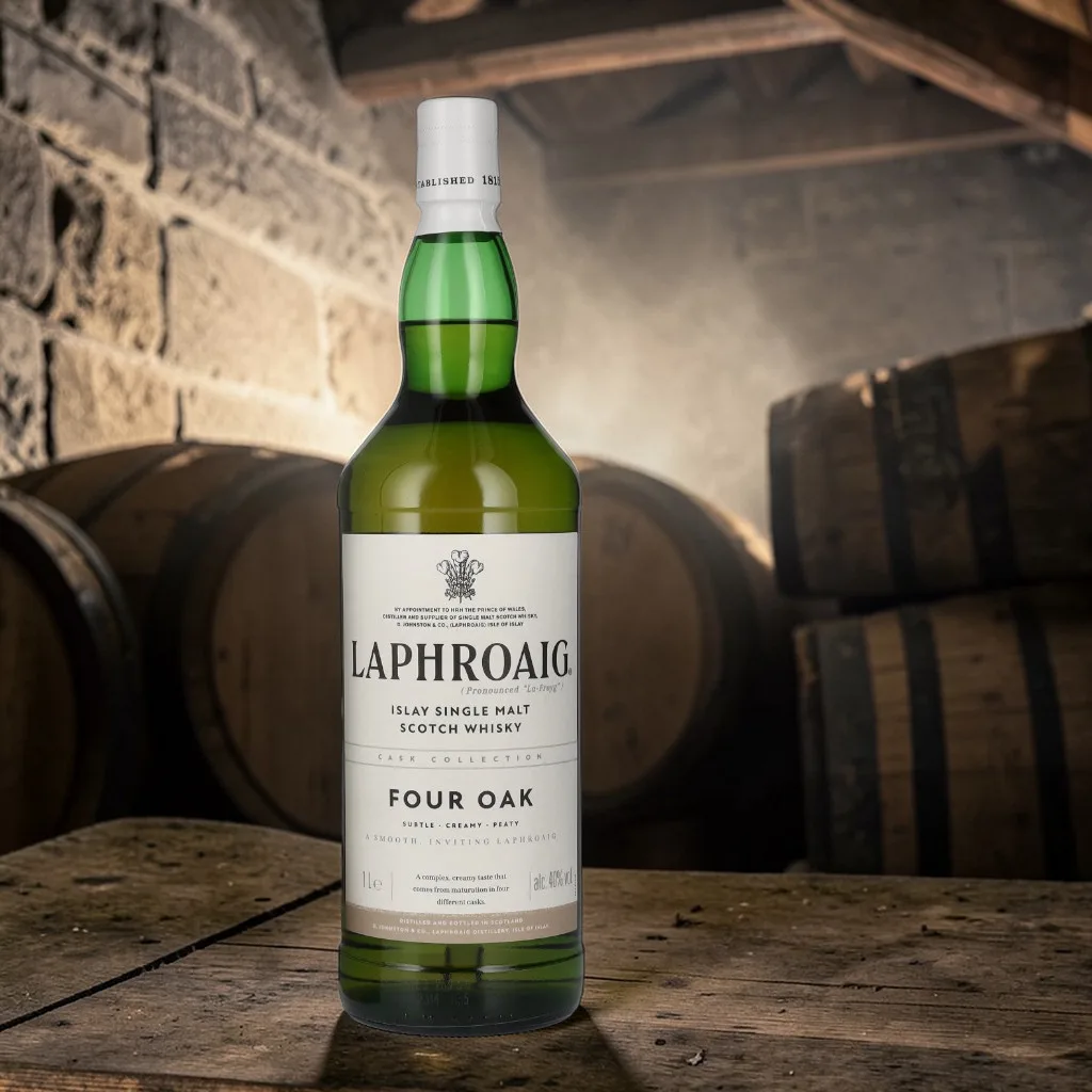 Au nez, Laphroaig Four Oak déploie une fumée de tourbe cendrée aux accents iodés et légèrement médicinaux, rejointes par de la vanille, une pointe de noix de coco, et des épices douces issues des différents chênes.