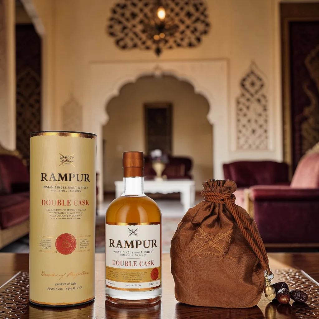 La robe de Rampur Double Cask apparaît ambrée profonde avec des reflets cuivrés, limpide et brillante.