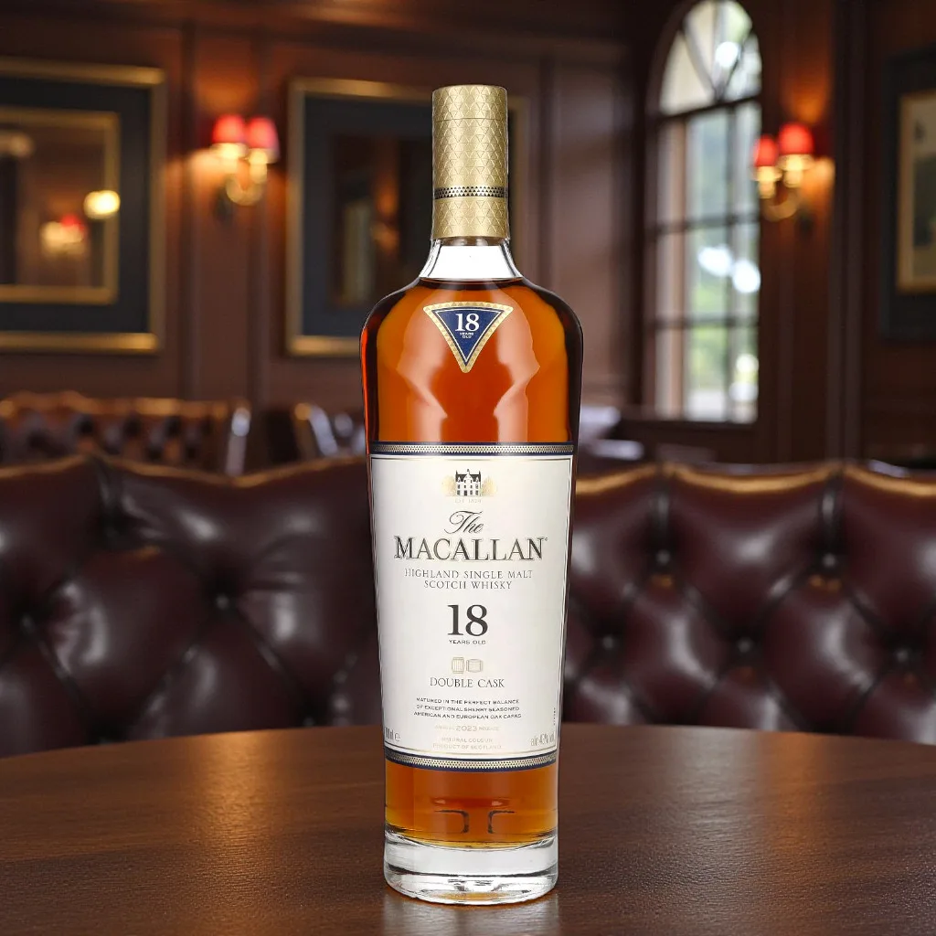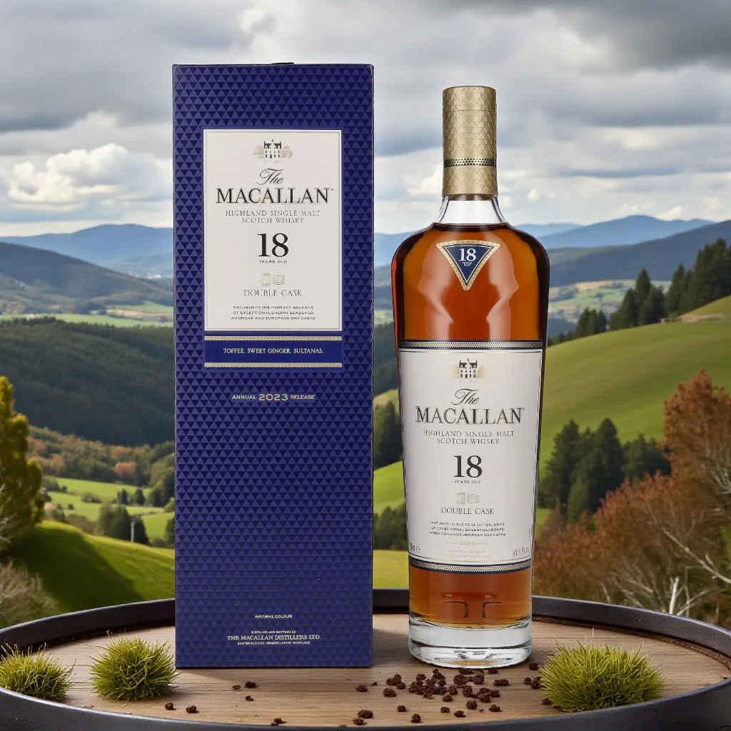 Au nez, The Macallan 18 Ans – Double Cask – 2023 dévoile d’emblée des fruits secs (raisin, sultanine), du toffee, des zestes d’orange et une pointe de gingembre. L’aération révèle des touches de vanille, de miel et de bois noble, avec une trame d’épices douces parfaitement intégrée.
